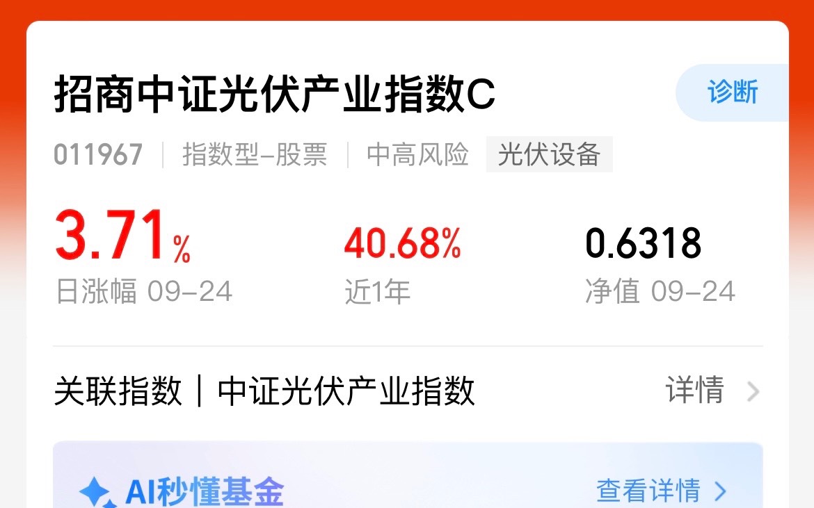 今日早盘指数分化,创业板指涨超2%,突破3200点,再创3年新高,盘面上光伏板块表现十分活跃,中证光伏指数盘中上涨1.43%,随着反内卷逐渐深入,光伏板块会迎来新的春天,随着中东和北非地区的发电量持续增长,其前景是可见的光明,我打算借助$招商中证光伏产业指数C$ (011967)进行布局,这个基已经三连阳,不仅近期业绩不错,长期业绩也亮眼,近一个月涨了13.19%,近三个月涨幅达到38.95%,还是非常不错的,我先安排发车了!