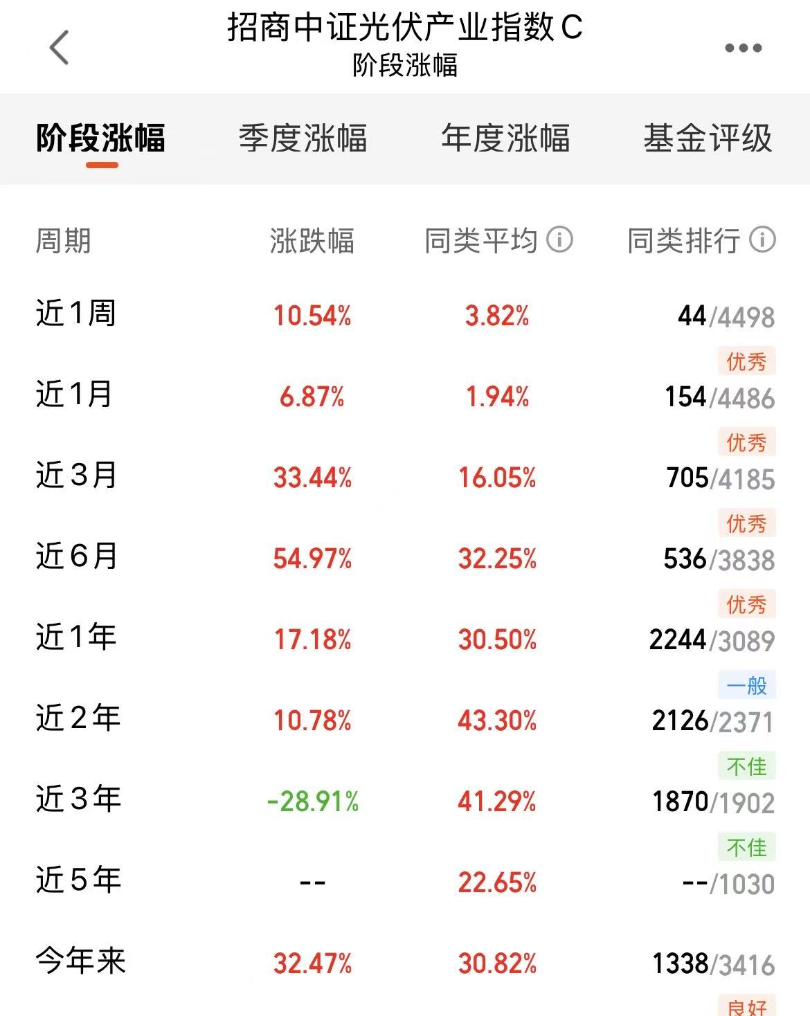 今天A股调整,不过板块分化,光伏延续上涨,确实是比较强呀,全球能源转型加速推动光伏需求,前景是不错的。$招商中证光伏产业指数C(OTCFUND|011967)$近一周涨幅10.54%,近三个月涨幅33.44%,业绩优秀,盈利强,重仓覆盖光伏全产业核心方向,我觉得长期持有不错的,继续看好这个方向了!