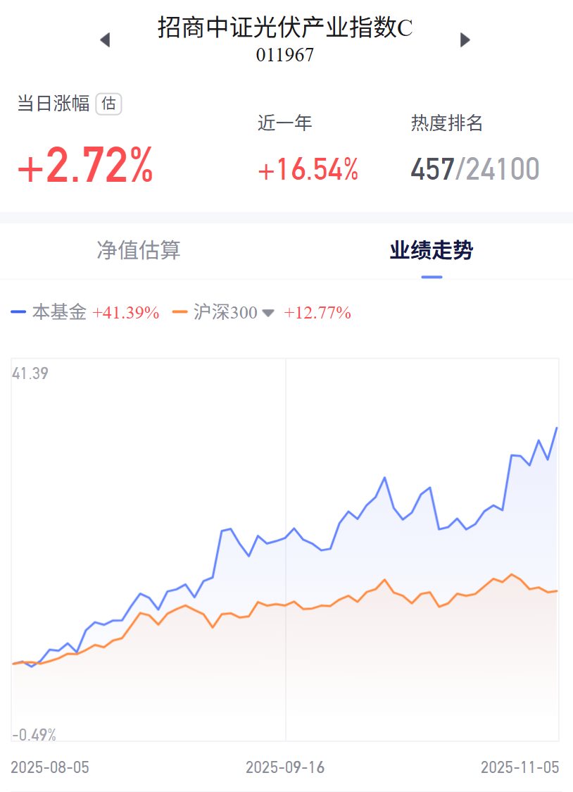 昨日电力方向全面爆发,招商中证光伏C大涨4.10%,今日午盘估值再涨2.7%,强势延续!微软CEO近日表示,当下全球算力扩张的真正瓶颈不在芯片,而在“电力供给”,这一观点直接点燃了电源设备、光伏、电池、风电等新能源板块的行情。随着全球能源结构加速转型,光伏赛道有望再度迎来政策与资金共振。此时上车,正是顺势而为,提前卡位未来增长主线。