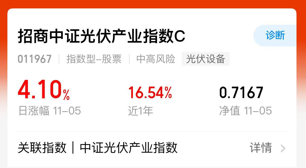 光伏板块最近有所回暖,机构做多情绪升温,光伏龙头企业三季报业绩亮眼。上次上面规划有提到加大对新能源领域的投入,同时行业处于周期底部,现在光伏板块也是可的$招商中证光伏产业指数C$ 这只基金在市场中领跑同类比其他的基金要亮眼许多。今天打算加一笔我看好目前光伏产业指数的中短期正在好转。