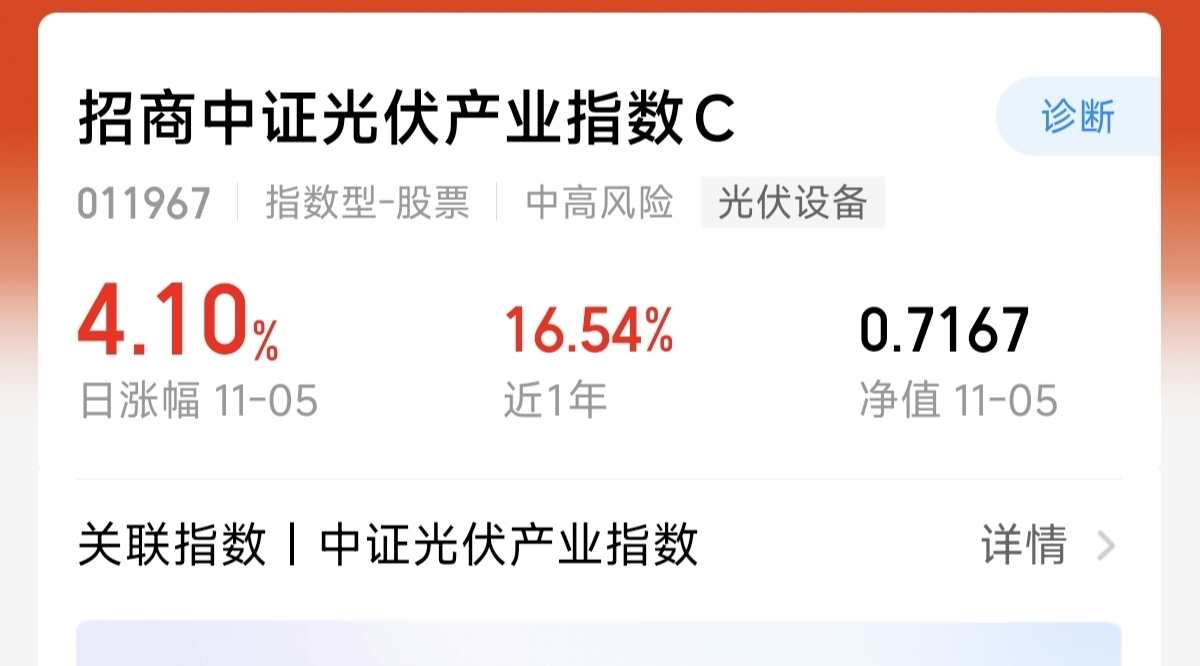 $招商中证光伏产业指数C$ 这是聚焦光伏产业的指数基金。紧跟指数的表现一直不错。昨天上涨了4.1%。近一年涨幅16.54%。全面覆盖光伏产业上下游产业链。而且遇到波动稳定性也是不错的。今天来看又要继续突破了。期待四季度继续创新高。