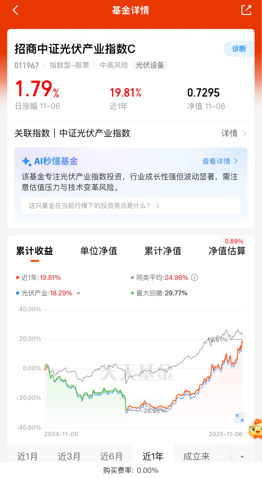 今日光伏板块低开高走,全天震荡收涨约1%,$招商中证光伏产业指数C$ 稳健上行。