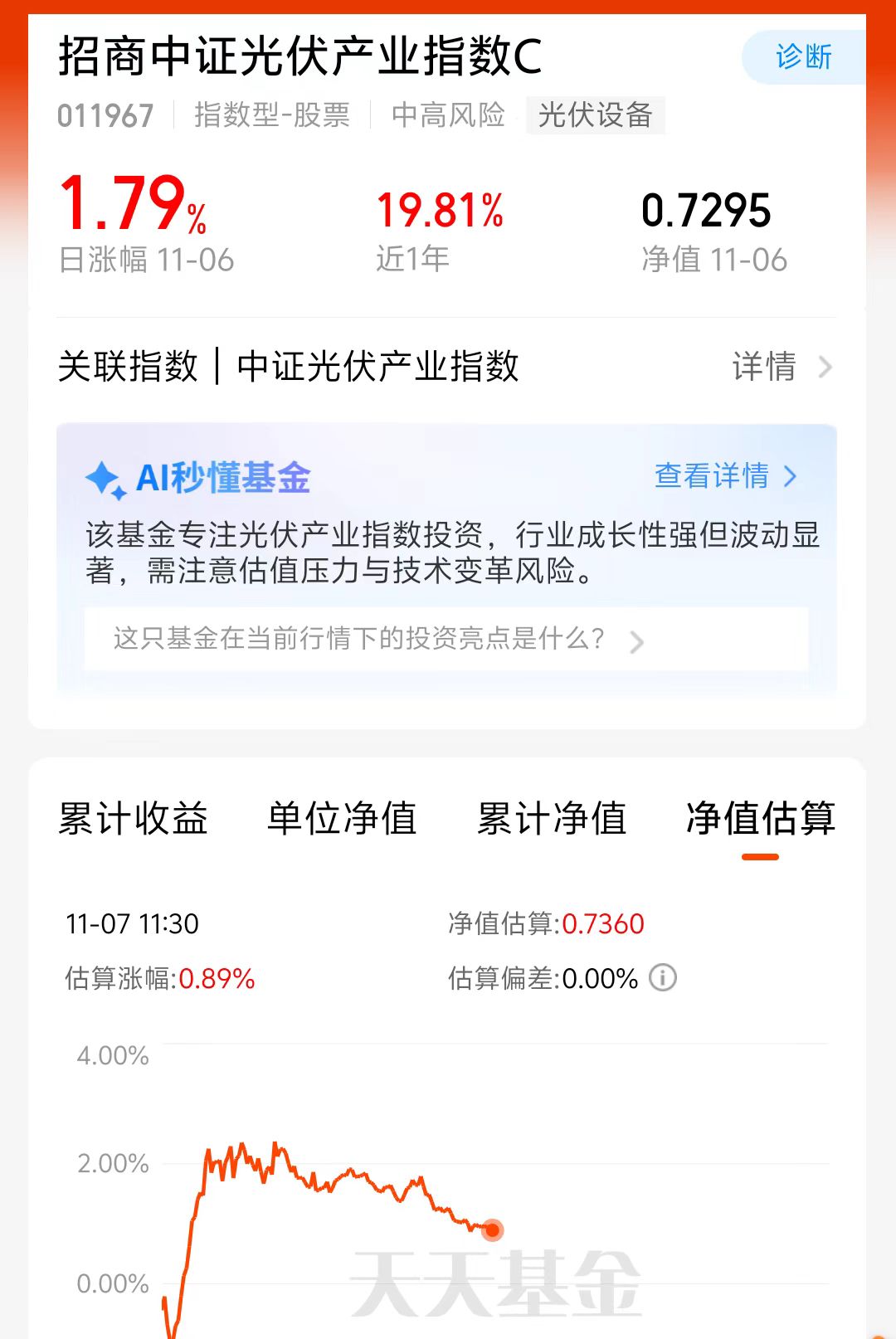 随着多晶硅重组“联合体”平台筹划中的消息落地,是从传闻走向筹划,直接点燃了光伏板块的行情,今日早盘光伏板块持续走强,通威股份涨停,多个股大涨,领涨整个市场。我是借助$招商中证光伏产业指数C$ 011967来跟上这波光伏的行情,该基昨日上涨了1.79%,今日早盘估值继续上涨,看第三季度的报告,现在光伏各个环节的利润已经开始逐渐好转,再有政策的加持,其前景还是比较可光的,我先布局上!
