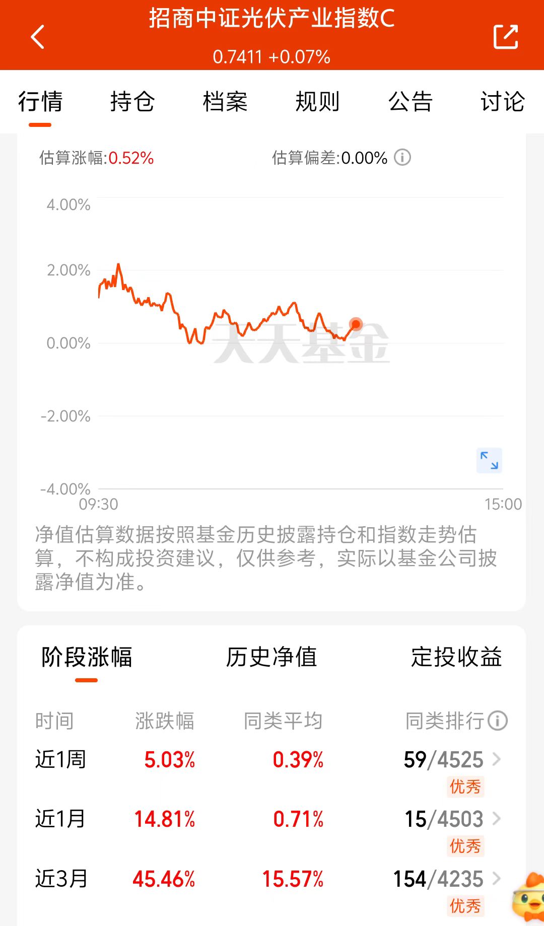 截止发文我持有的$招商中证光伏产业指数C$ 011967估值上涨0.52%,该基聚焦光伏产业链,其业绩优秀,近一月上涨了14.81^%,近三月上涨了45.46%,近六月上涨了61.67%,虽然最近我A一直在震荡,但随着光伏板块季报好转,加之多晶硅重组“联合体”平台筹划中的消息落地,带动着光伏板块逐渐走强,未来是科技未来,而拥有数据中心的则最终赢取天下,可见光伏这个赛道的前景还是比较明朗的,我将持续关注!