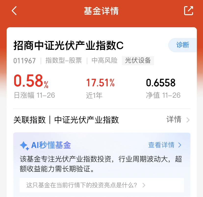 今天股市反弹,光伏板块也跟着回暖啦!三季报数据挺好,光伏各环节利润大多好转,主材行业亏损大幅缩窄,还有企业率先盈利,妥妥的行业利好。资金已经主动买入布局,我关注到$招商中证光伏产业指数C(OTCFUND|011967)$近半年也涨了 44%,业绩挺亮眼。行业景气度慢慢回升,这只基金能精准跟踪光伏赛道,大家可以多留意,找准时机上车。