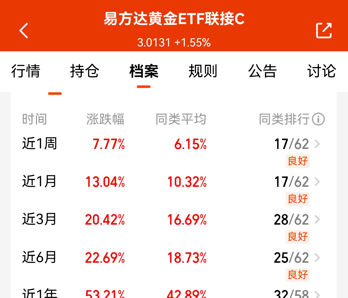 ,近一周涨幅7.77%,近一个月涨幅13.04%,近一年涨幅53.21%,弹性十足,短期中美在多个领域博弈升级,市场波动加剧,黄金避险。
