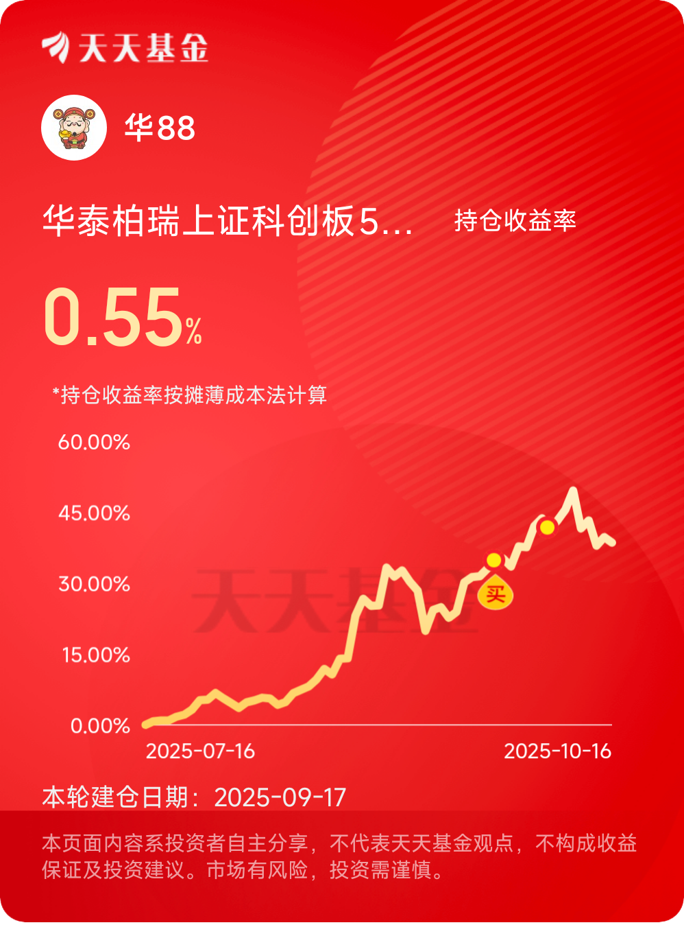 近期复盘,$华泰柏瑞上证科创板50成份ETF联接C$ 近3个月38.58%的收益率强化了我的信心。科技主线逻辑未变,计划利用波动适时提升持仓比例。#晒收益#