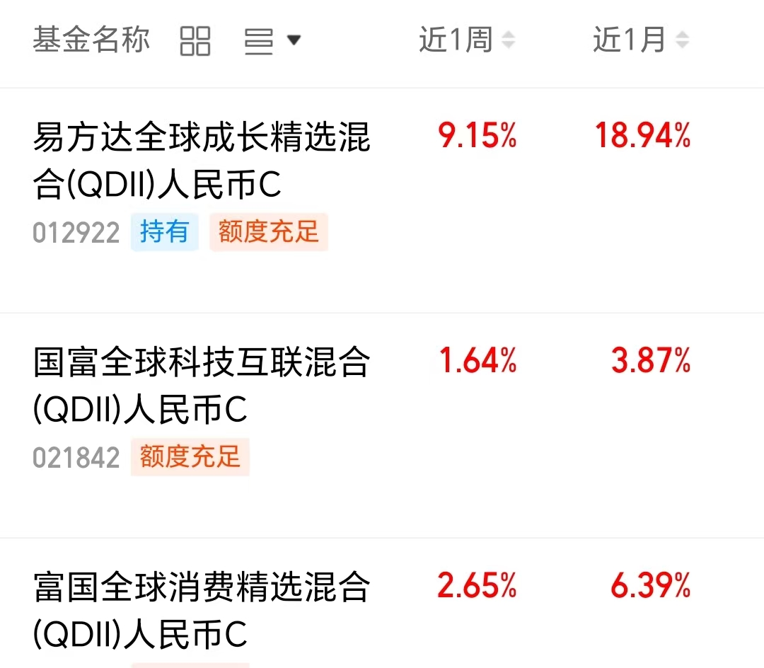 今日A股市场集体高开,港股低开高走震荡拉升,周五美股科技逆势上涨;在眼下科技行情爆发之下,各地市场轮番爆发,买科技得有全球视野,各个市场的机会都不能错过。我打算布局$易方达全球成长精选混合(QDII)人民币C(OTCFUND|012922)$一键覆盖全球科技龙头,把握多个市场的科技成长机会。这基近一周上涨9.15%,近一个月上涨18.94%,大幅跑赢同类产品,还不错。
