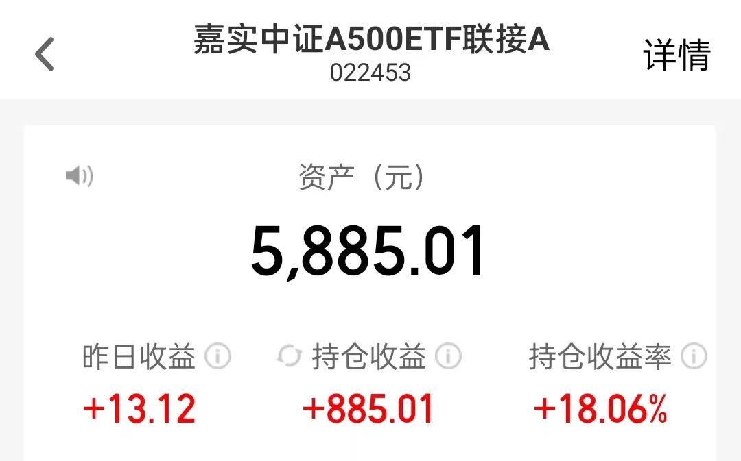 对于指数类产品来说,只要选好,介入时间合理,操作方法得当,是比较容易获取正收益的。我们去年11月开市布局的嘉实中证A500ETF联接A基金定投的效果就还不错。累计定投了差不多一年,一共投资5000元,目前收益为885.01元,定投持仓收益率达到了18.06%。