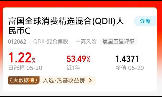 在如今市场波动的大环境下,想要寻找高性价比的投资机会?富国全球消费精选混合 (QDII) 人民币 C 绝对是你的不二之选!昨晚大涨 1.22%,近一个月涨幅达 10.52%,近六个月涨 37.05%,近一年更是高达 53.49%,同类排名。它重仓泡泡玛特、阿里、腾讯等新兴消费龙头,覆盖 A 股、港股、美股等 6 大市场,全球消费领域一网打尽。无论市场风向如何变化,凭借均衡的配置策略,总能精准把握消费红利,投资价值肉眼可见,此时入手,开启财富增长新征程!