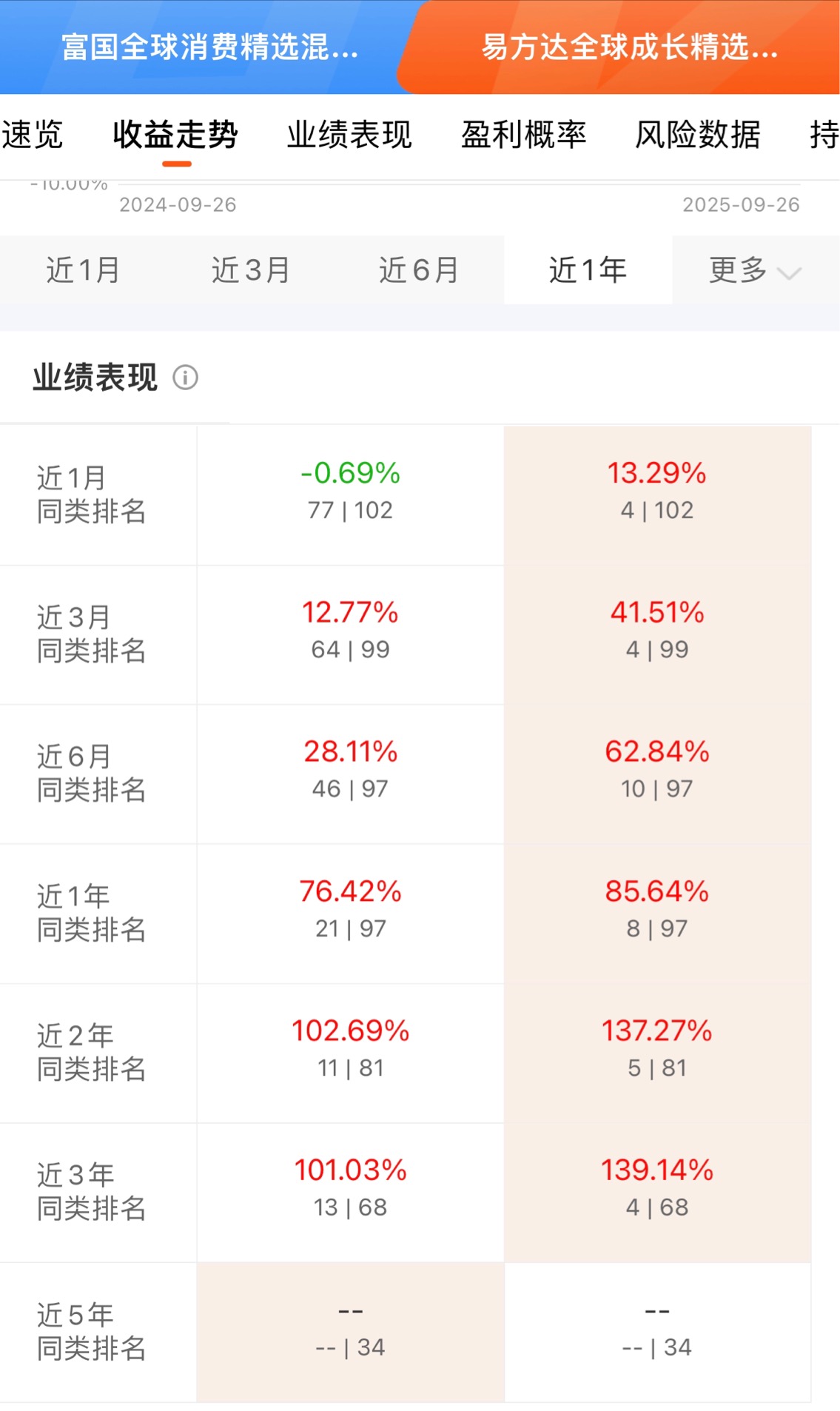 近期走势显示,易方达全球成长精选混合(QDII)人民币C大幅跑赢竞品(详情见下图),在降息周期逐步开启的背景下,全球科技类资产迎来普遍利好。美股的机器人和AI龙头具备先发优势,A股的算力与硬件环节在产业链中不可或缺,港股的互联网巨头则是AI应用落地的最大受益方。