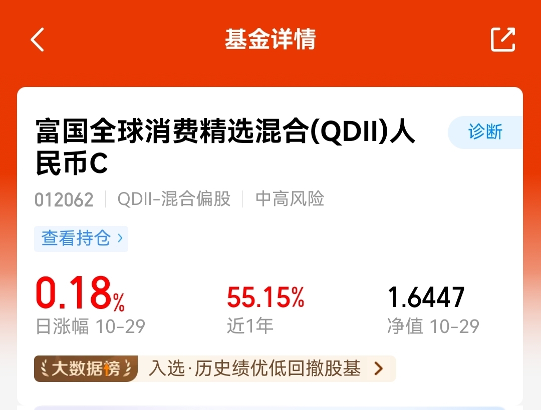 来了,最新净值更新,今天消费板块逆风上涨,$富国全球消费精选混合(QDII)人民币C$ 大涨0.18%,不错,不愧是历史较优回撤的基金,后续值得期待!