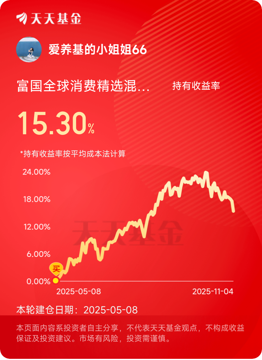 今年上半年新消费走出了主线行情,表现相当亮眼,近几个月一直在盘整,估值回落了不少,风险消化上涨空间打开,现在又处于消费旺季,新消费大概率是逐步回暖了,$富国全球消费精选混合(QDII)人民币C$ 聚焦全球新消费领域,成分股都是新消费代表,成长性高弹性大,可以同时把握多个消费市场的行情,也分散了单一市场的风险,近一年最大回撤仅11.75%,回撤低,近一年+51.94%,业绩表现优秀,真是能涨抗跌!