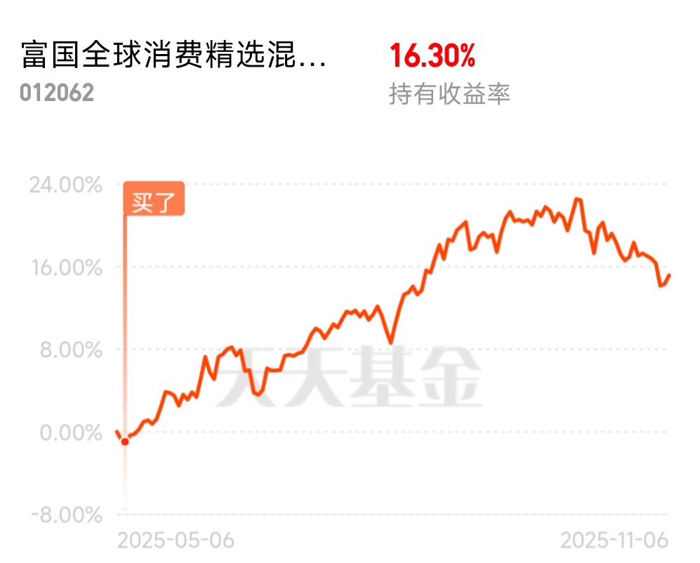 这段时间消费板块真是利好不断,今天又出了提振消费的重磅利好,看来大行情就要来咯,这样的趋势下,我更看好新消费赛道,今年上半年就有非常亮眼的表现,$富国全球消费精选混合(QDII)人民币C$ 聚焦全球新消费龙头,成分股阿里、腾讯、泡泡玛特、老铺黄金、三丽鸥等都是新消费代表,成长性高赚钱能力强,近一年涨近54%,也继续优秀