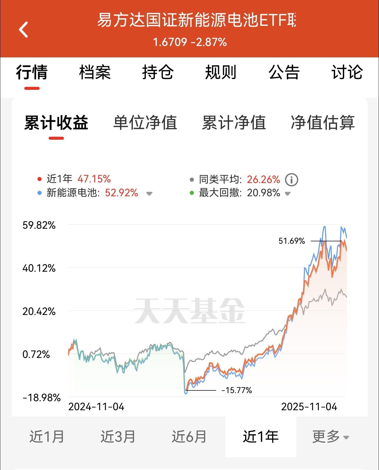全产业链覆盖:基金精准布局国证新能源电池指数,一揽子打包赣锋锂业(上游材料)、宁德时代(中游电芯)、阳光电源(下游储能)等各环节核心龙头,让您无需研究个股、判断技术路线,即可共享全链增长红利。