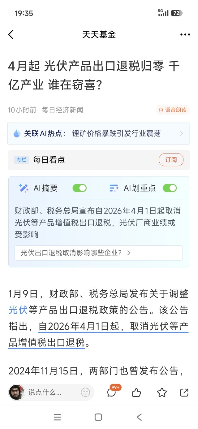 利空来了。光伏电池取消退税。2美联储降息大门突然关闭。我还没有回本大家给个建议要