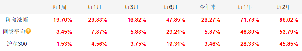近一年大涨71.73%,跑赢同类平均超25%;近1周大涨19.76%,同类平均仅涨3.45%,超额收益高达16%。