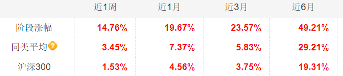 近6月大涨49.21%,跑赢同类平均高达30%;近一周大涨14.76%,跑赢同类平均超11%。综合表现很优秀,今天加仓一笔,后市如有回调继续择机低吸。
