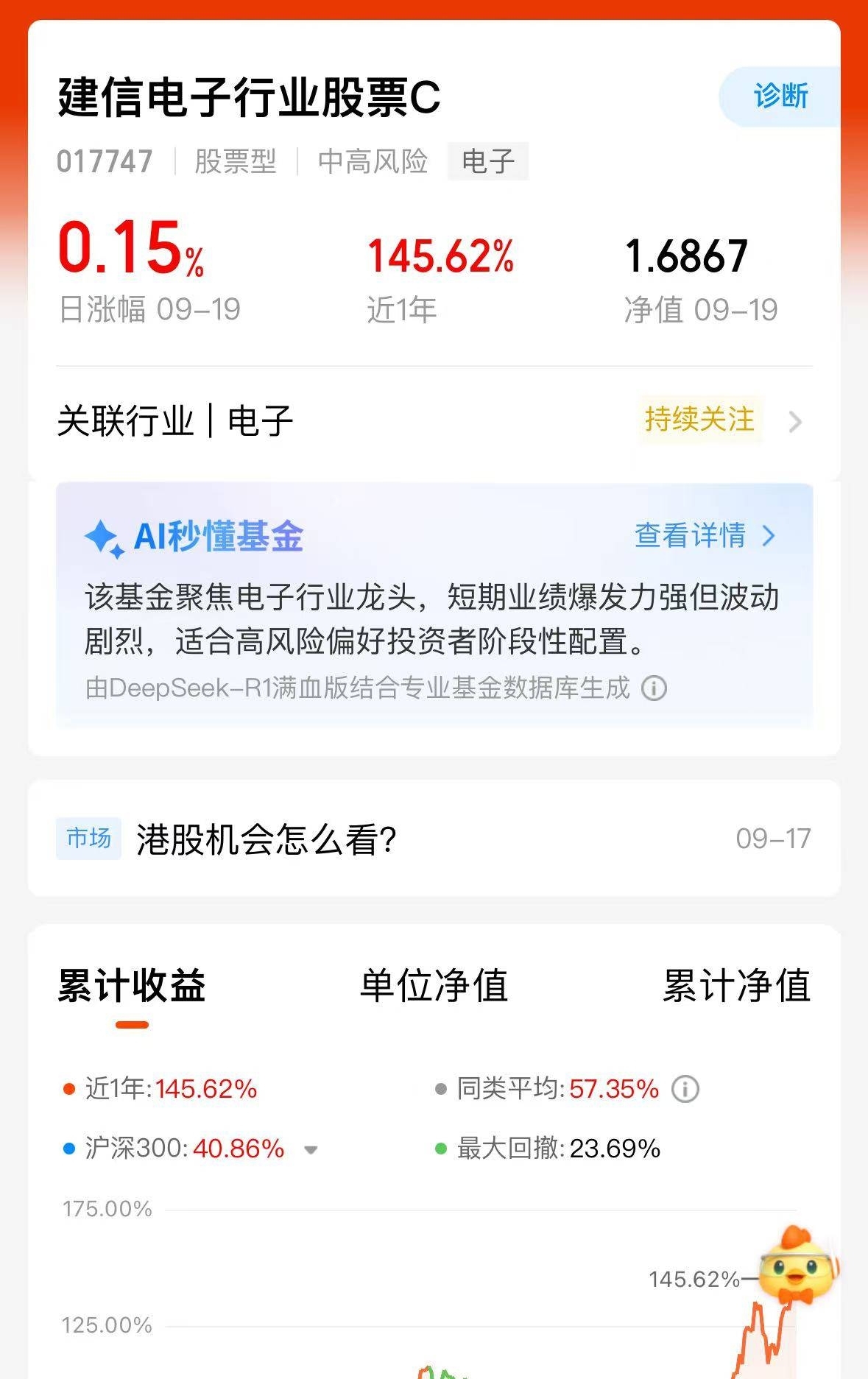 建信电子行业股票C近一月20个点收益稳居前列,今日估值涨4.81%持续发力,消费电子与半导体双主线持仓弹性尽显。