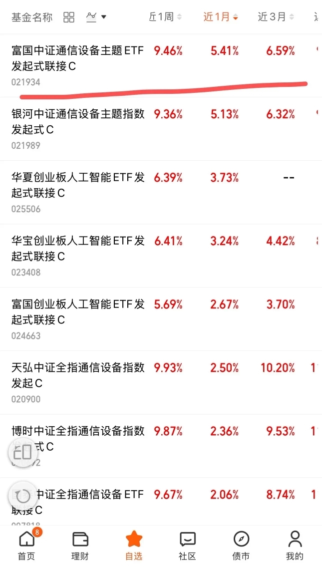 这段时间华宝医疗那块没啥动静,就把注意力转到了富国中证通信设备主题ETF联接C上——近一周涨了9.5%,一个月赚5%,半年更是冲出96%的涨幅,超越大多数同类;它还是市场上中兴通讯、中际旭创持仓最高的基金,这两家公司这季度实际赚到的钱比上季多了11%。现在指数价格比过去五年27%的时间都低,回本也快,最差时55天就收复失地。作为通信设备领域里持仓主要度高的选择,它确实值得考虑配置,尤其还是市场上中兴通讯、中际旭创持仓最高的基金。$富国中证通信设备主题ETF发起式联接C$