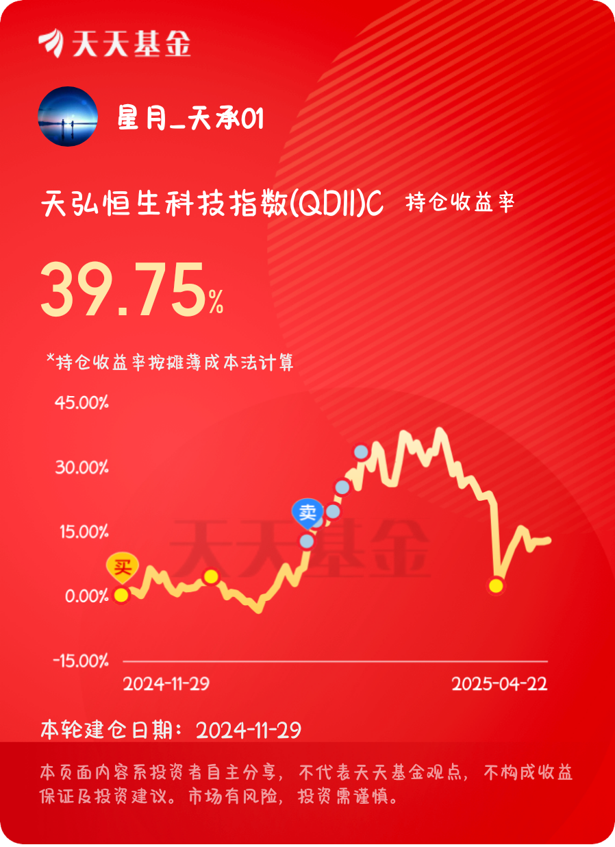 若追求安全性,每一次上车机遇都是可遇而不可求,在下也从不奢求,得之幸也,失之便是无缘,何须患得患失。但机遇若现,便要把握!(说得简单,但4.7日敢于逆势抄底的玩家又有多少呢?正如同暴涨时大部分玩家亦不舍得分批止盈一般。捕获机遇,高抛低吸,落子便无悔,盈利便是如此简单。)(只做笔记,不做推荐,操盘有风险,不要乱跟哦)$天弘恒生科技指数(QDII)C$ #晒收益#