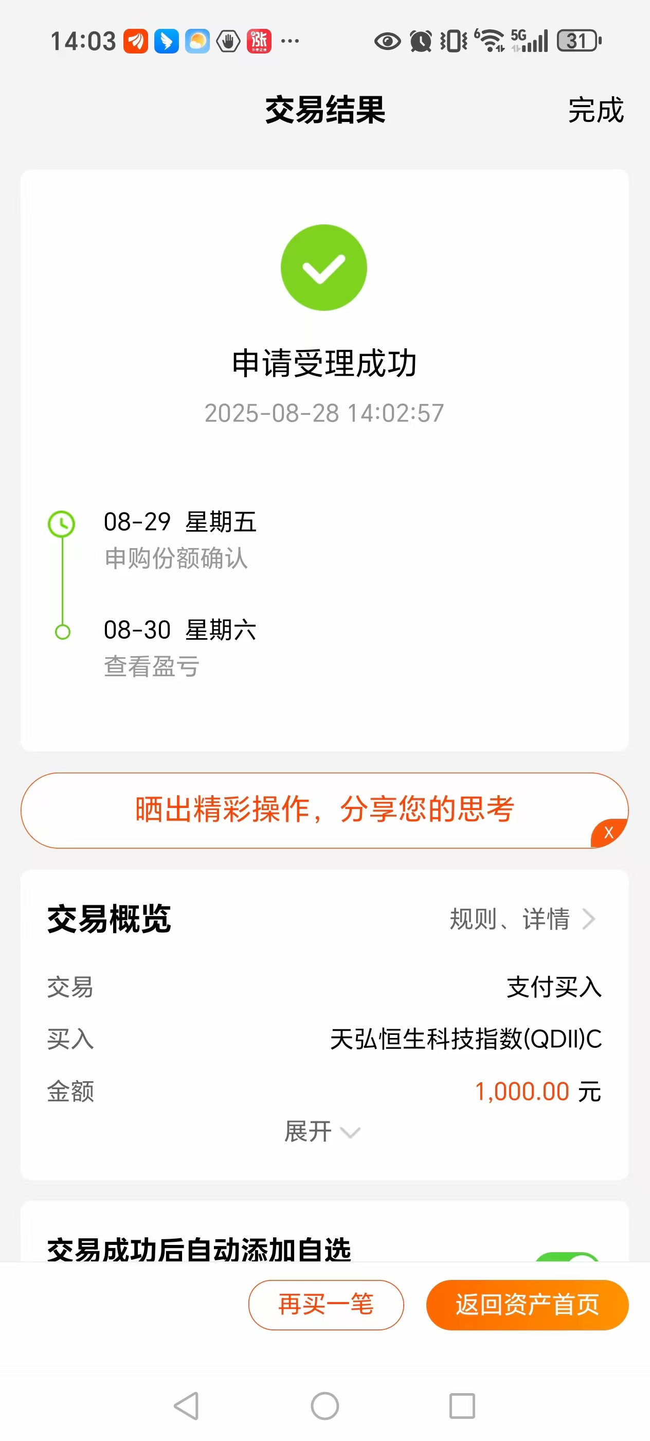 买入$天弘恒生科技指数(QDII)C$ 1000元