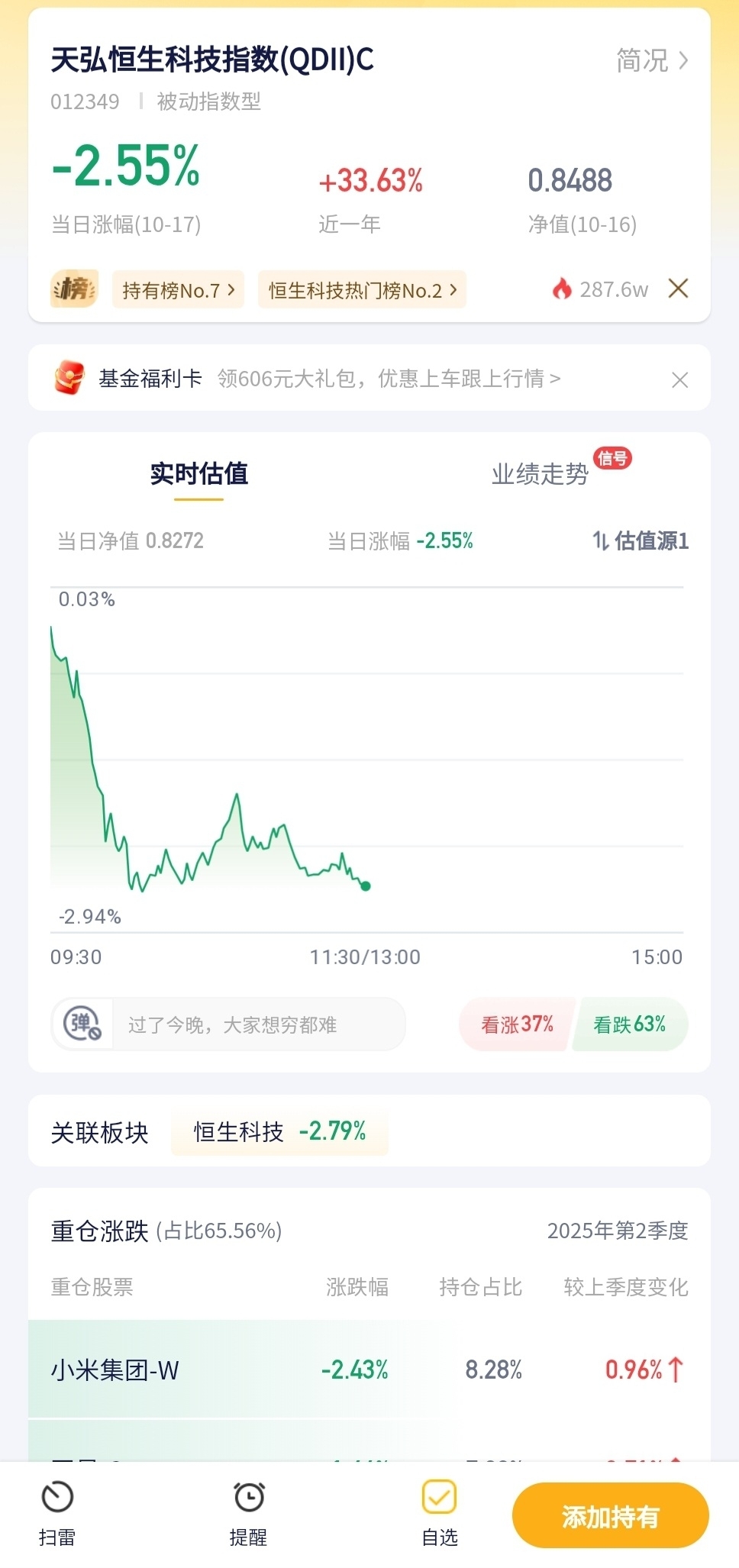 天弘恒生科技指数(QDII)今日预估跌幅2.55%!