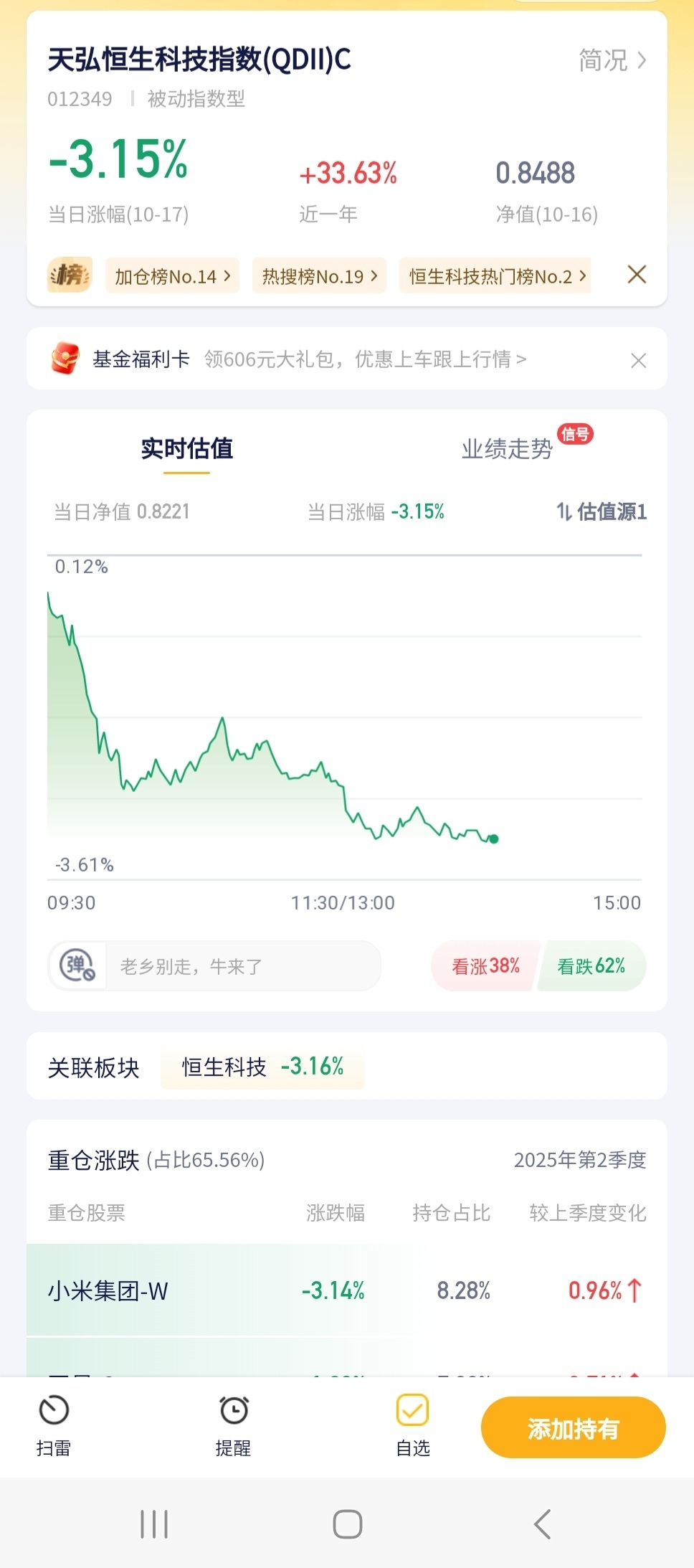 今天这基金跌得不少,恒生科技那边表现拉胯,科技类个股不给力,拖累这跟踪的基金也下跌不少。