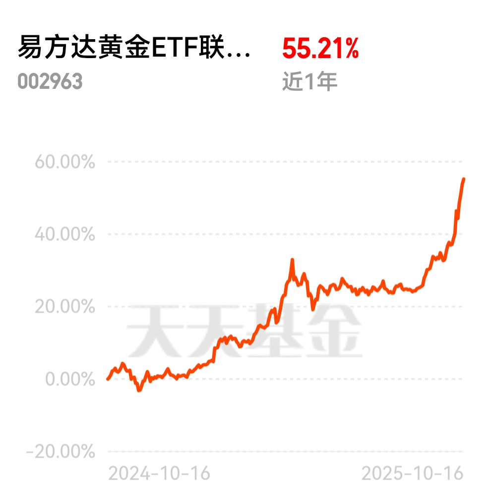最近黄金太火了!今年涨幅最高,牛市妥妥的。易方达黄金 ETF 联接 C 今天涨 3 个点,近一月 15.09%、近一年 55.21%,比同行强,博弹性盯紧。