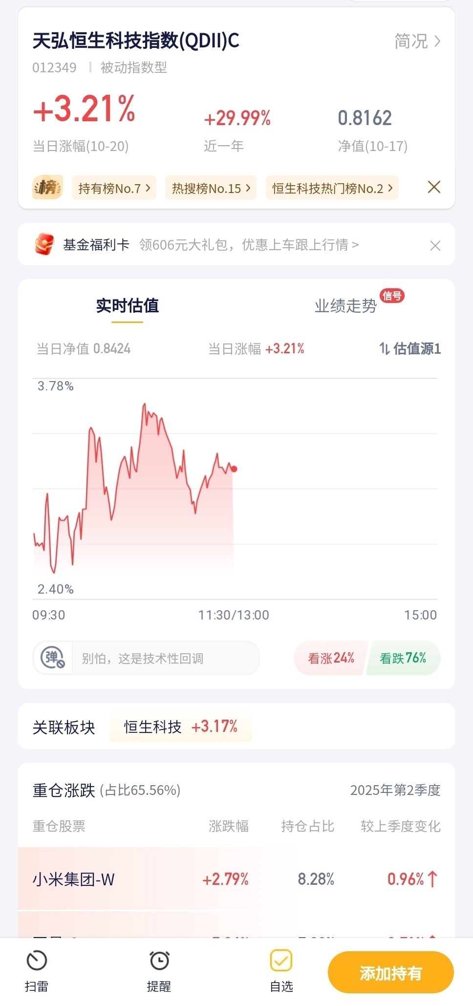 天弘恒生科技指数(QDII)今日预估涨幅3.21%!