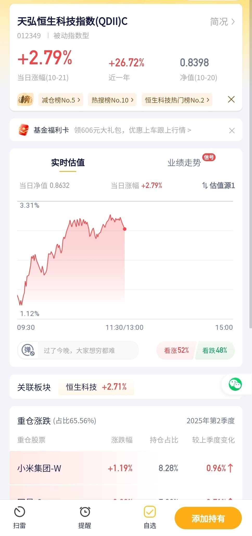 天弘恒生科技指数(QDII)今日预估涨幅2.79%!