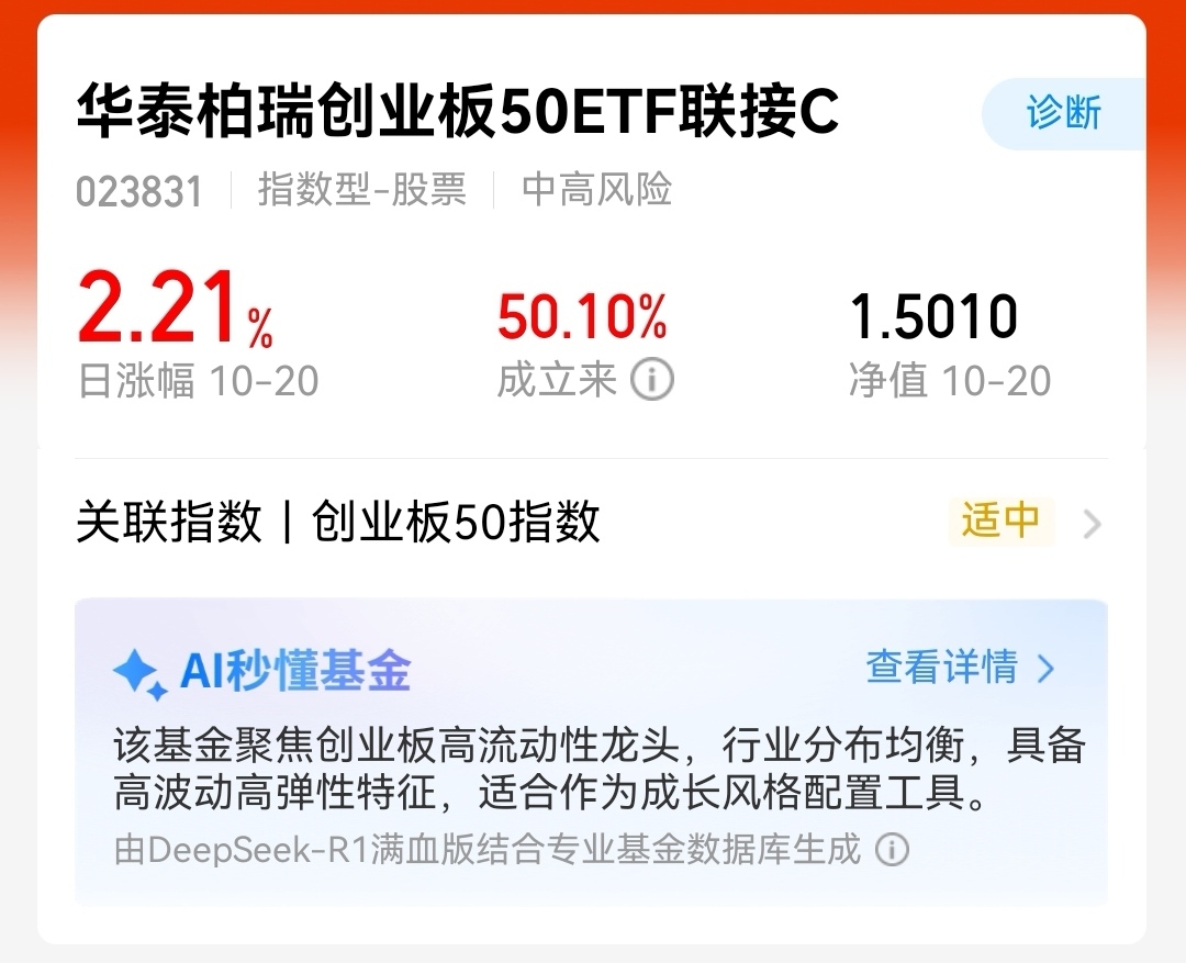 开盘就看见$华泰柏瑞创业板50ETF联接C$涨超3%,近三个月收益33.9%相当