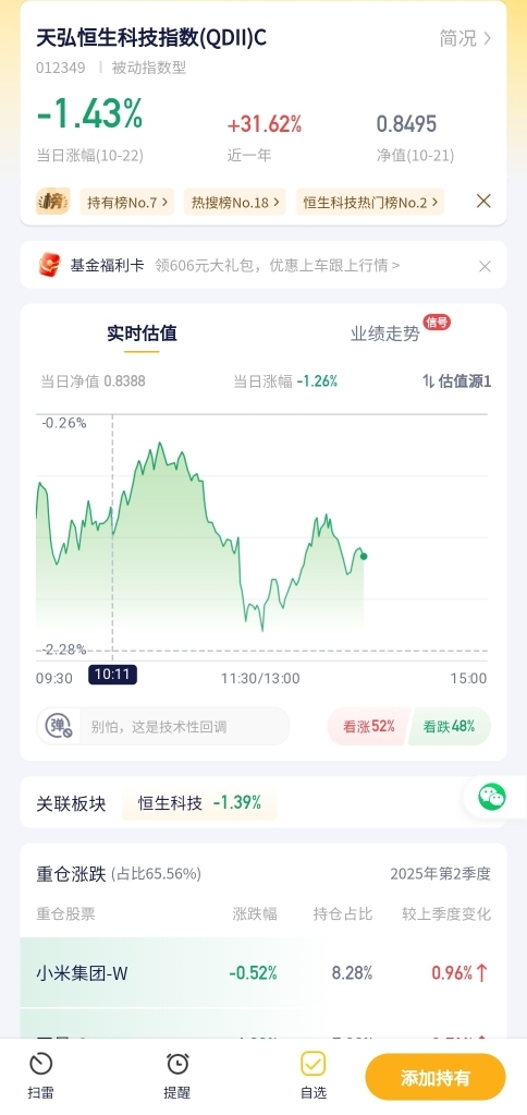 天弘恒生科技指数(QDII)今日预估跌幅1.43%!