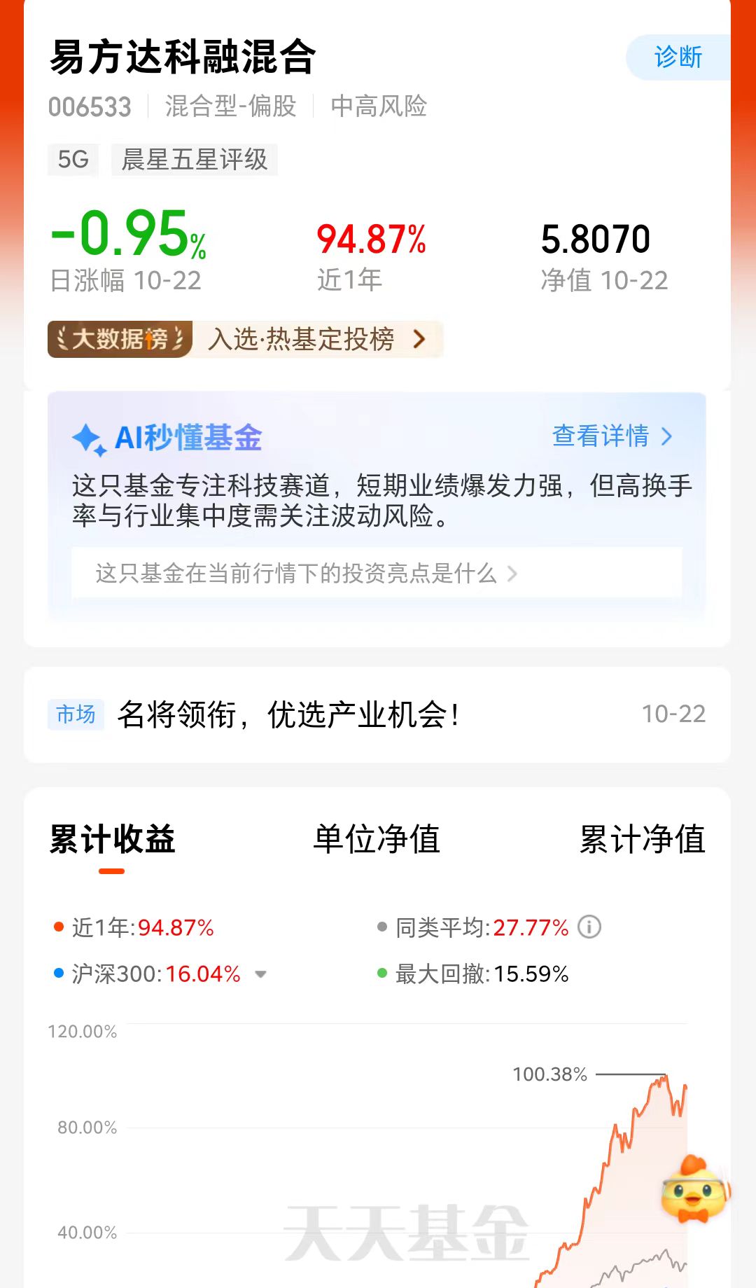 科技板块细分多,单一赛道风险还是有点大,还是均衡配置的更有优势,比如易方达科融混合006533,不仅买了科技,还买了反内卷相关的新能源相关的,深度参与科技、新能源、军工轮动配置,夏普比率优秀,可以说是成长里的均衡之选。