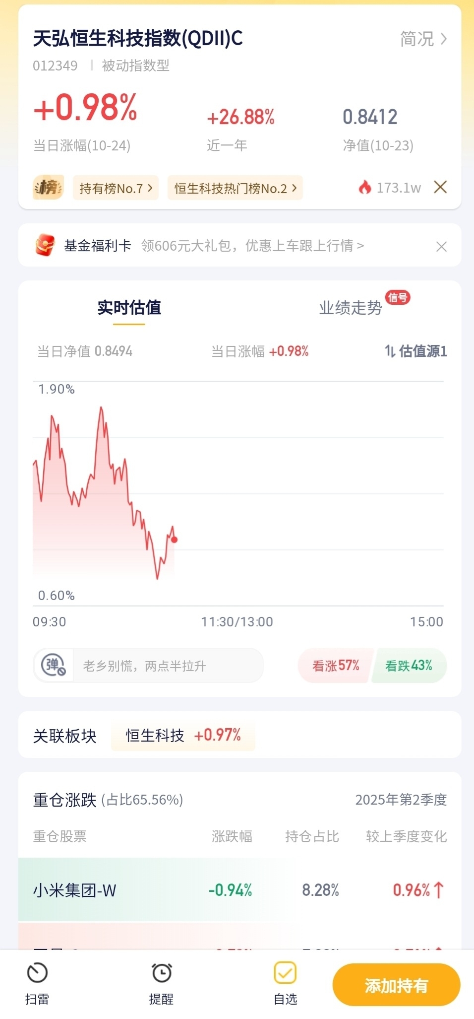 天弘恒生科技指数(QDII)今日预估涨幅0.98%!