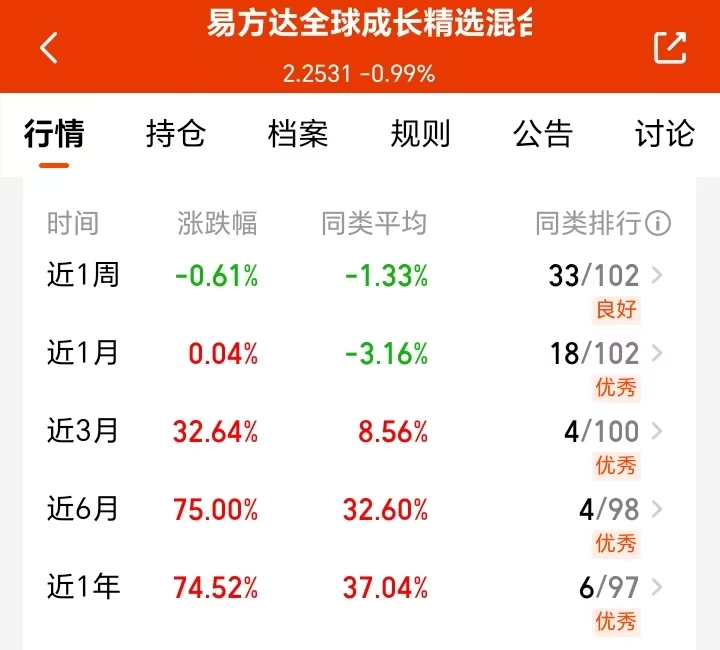 近期科技板块调整,不少科技基回撤不少,不过我发现这个 易方达全球成长精选混合C 回撤控制的不错,看得出基金经理调仓能力了,近半年75%的涨幅也领先同类。这个是可以覆盖全球科技龙头,也不怕单一市场风险,我打算继续拿着看看后续表现。