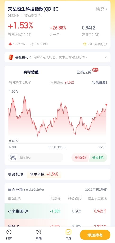 恒生科技今天涨了点,天弘这指数基金跟着涨了1个多点,在港股科技赛道里表现还行,持有它的朋友今儿也有收益。