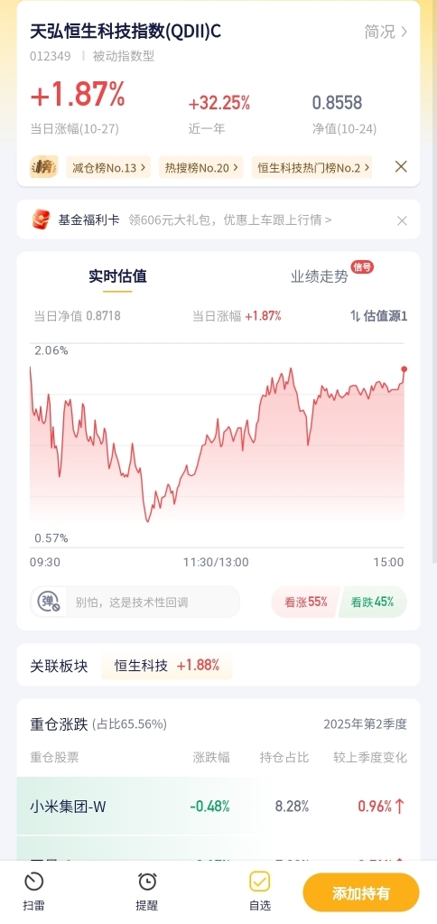 天弘恒生科技指数(QDII)今日预估涨幅1.98%!