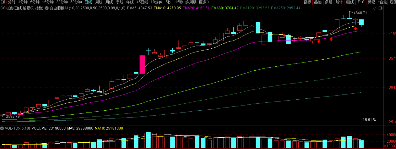 CS电池,上升趋势,我昨天左侧入场,今天看,早了些。接下来继续找更好的点位。