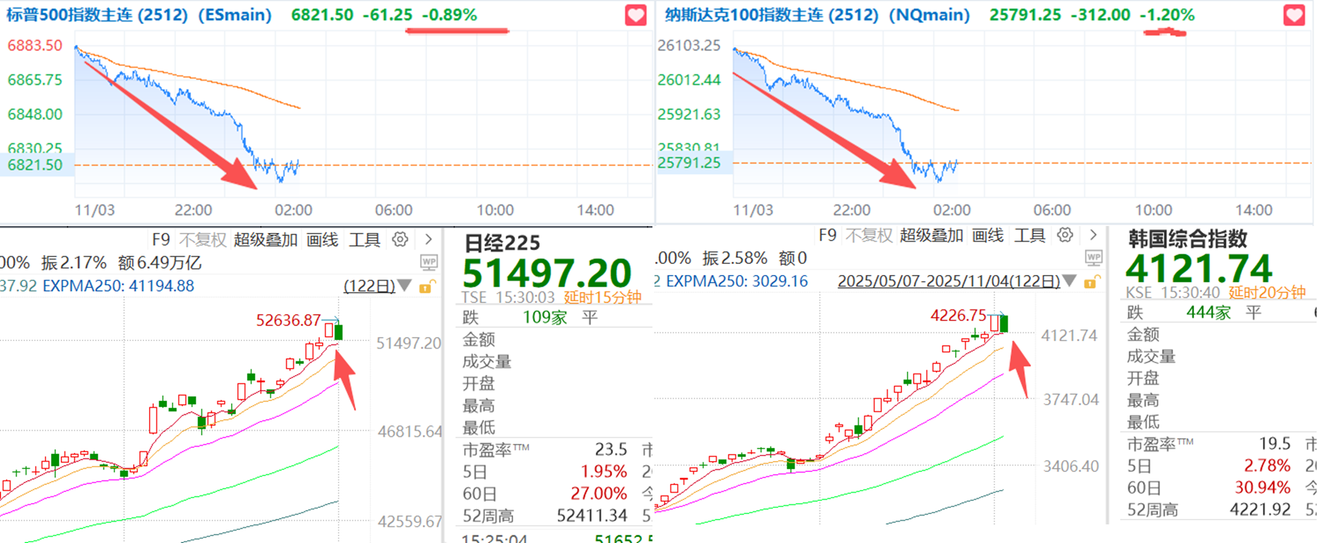 日韩在连续大涨后,今天终于出现疲态,开始调整。