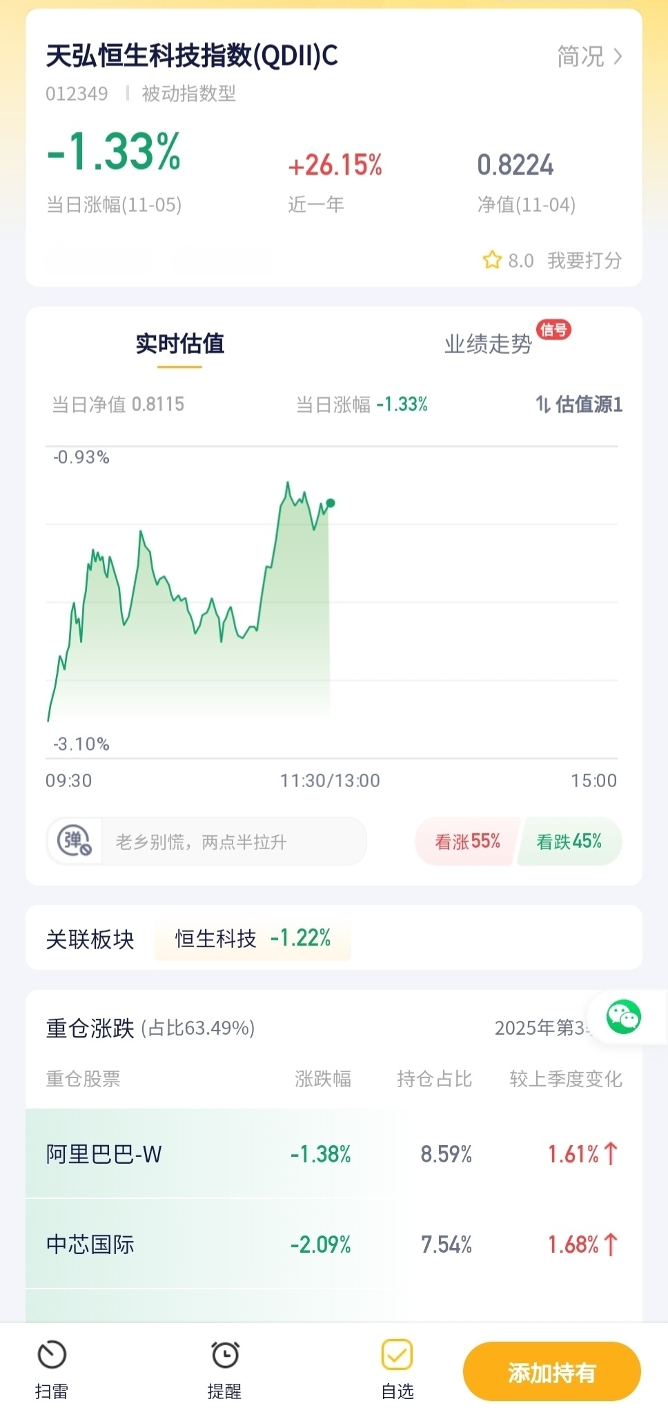 天弘恒生科技今天跌了1.33%,恒生科技板块今天表现拉胯,这基跟着遭殃,持有它的朋友今天心里估计有点难受。