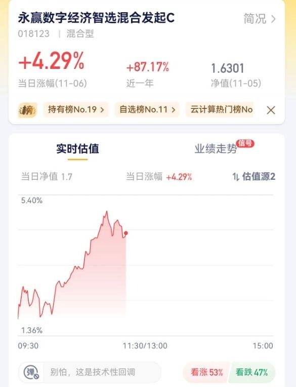 算力,我加仓1000元$永赢数字经济智选混合发起C(OTCFUND|018123)$。这是一个算力概念的基金,前一段时间刚好也参与做了一波收益,今天企稳了可以开始做反弹了。AI还是未来几年的主线,AI等新技术应用的不断发展,当前市场对算力的需求巨大,我们看存储芯片环节就不断的涨价了。而算力板块带来的业绩,将在后期提现出来,AI算力的国产化也将实现提速,今天算力企稳了先建仓一份等后续继续参 。