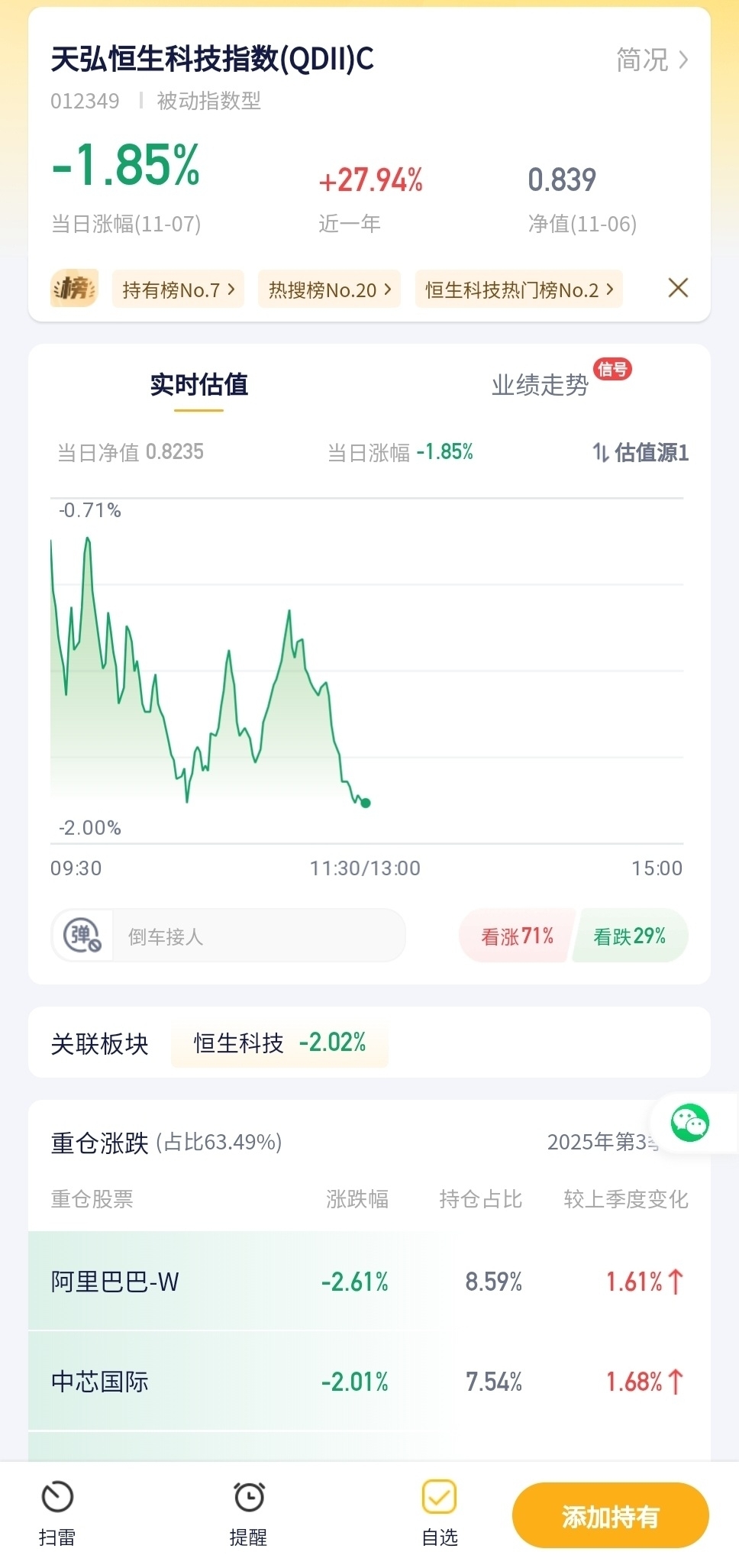天弘恒生科技指数(QDII…今日预估跌幅-1.85%!