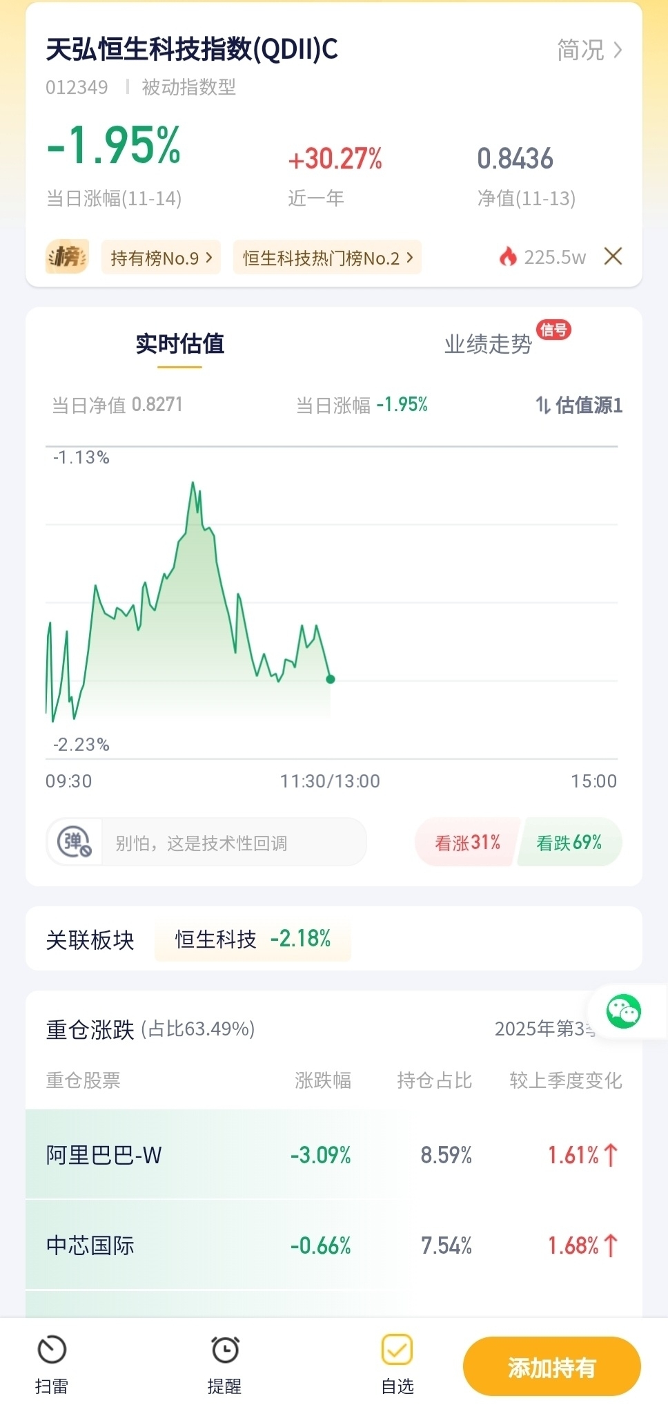 - 天弘恒生科技指数(QDII)今日预估跌幅-1.95%!
