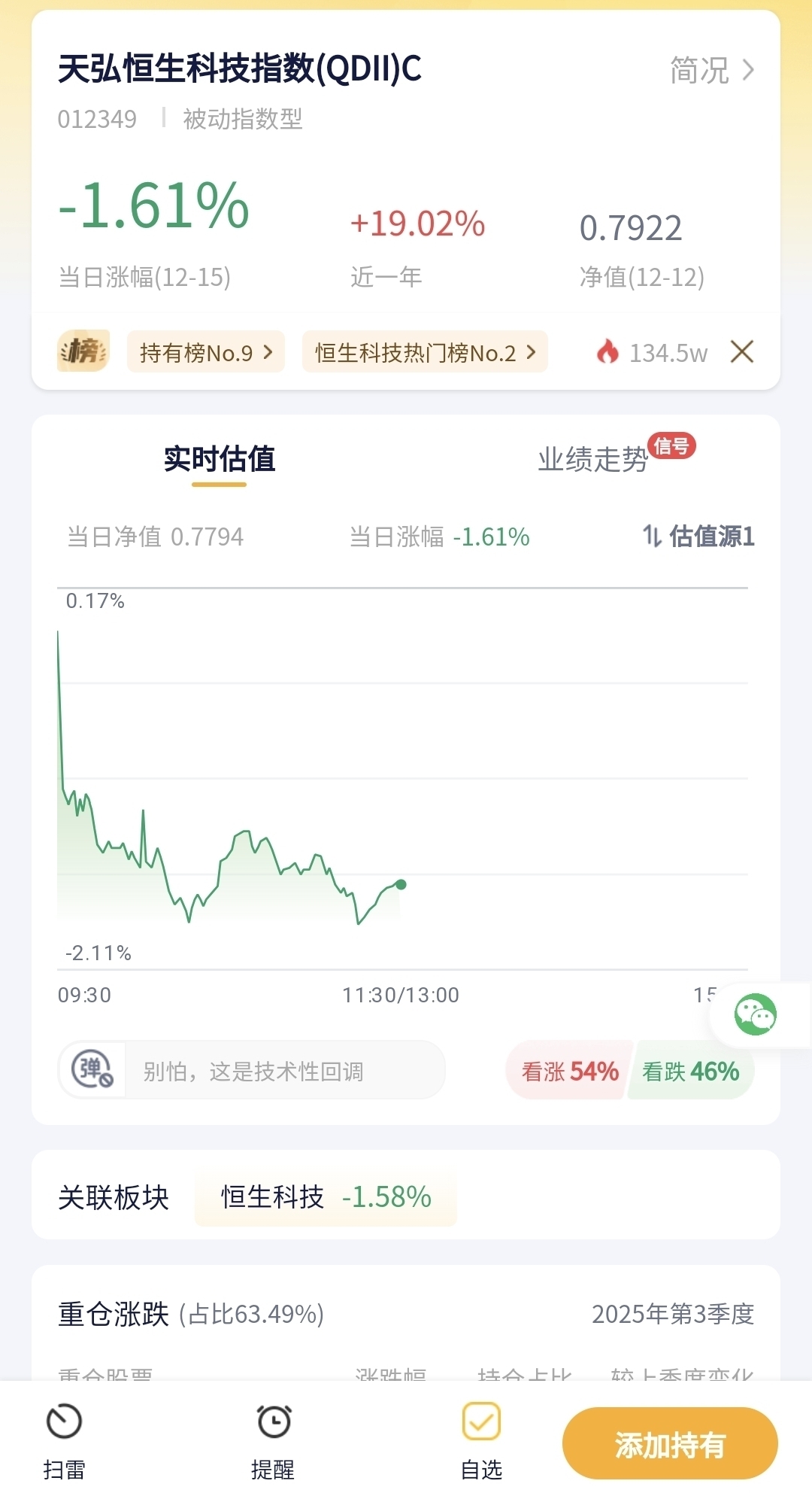天弘恒生科技指数(QDII)今日预估跌幅1.61%!