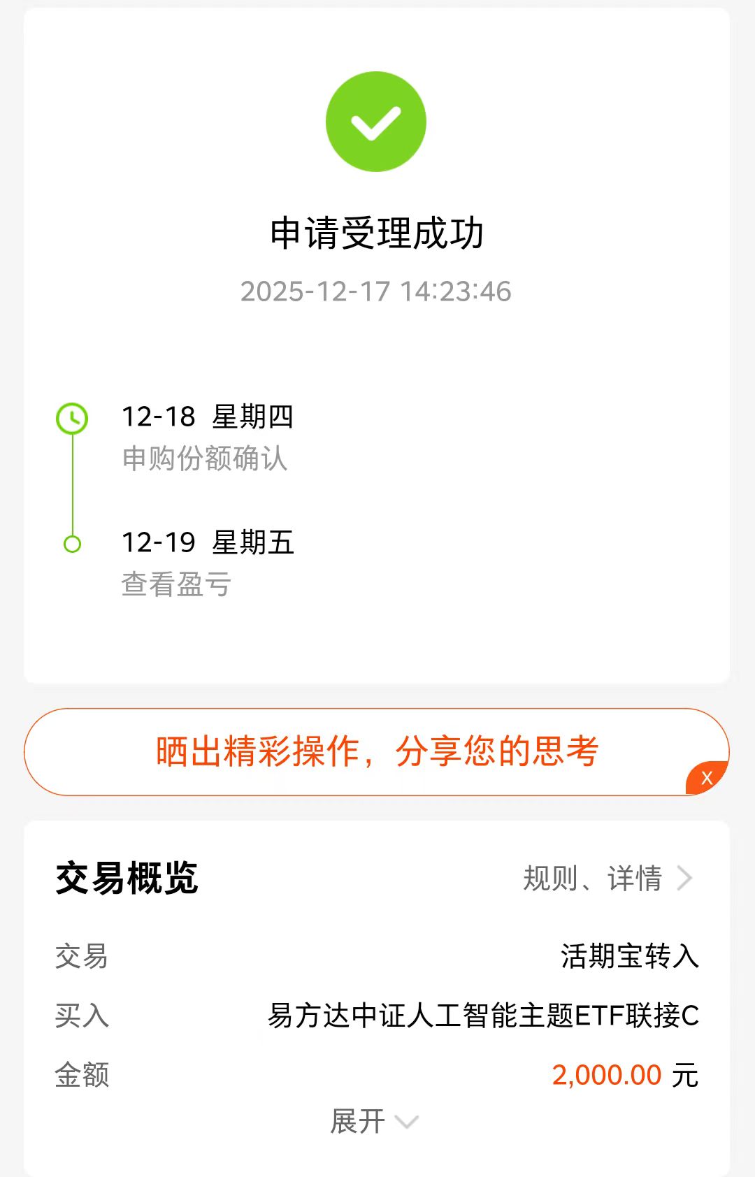 今天股市行情反弹,尾盘暴涨了,涨幅拉升了不少呢,人工智能发展快速,我坚持看好这个赛道,最近国内外热点利好也比较多,利好行情上涨呢,我加仓易方达中证人工智能主题ETF联接C。业绩优秀,跑赢同类