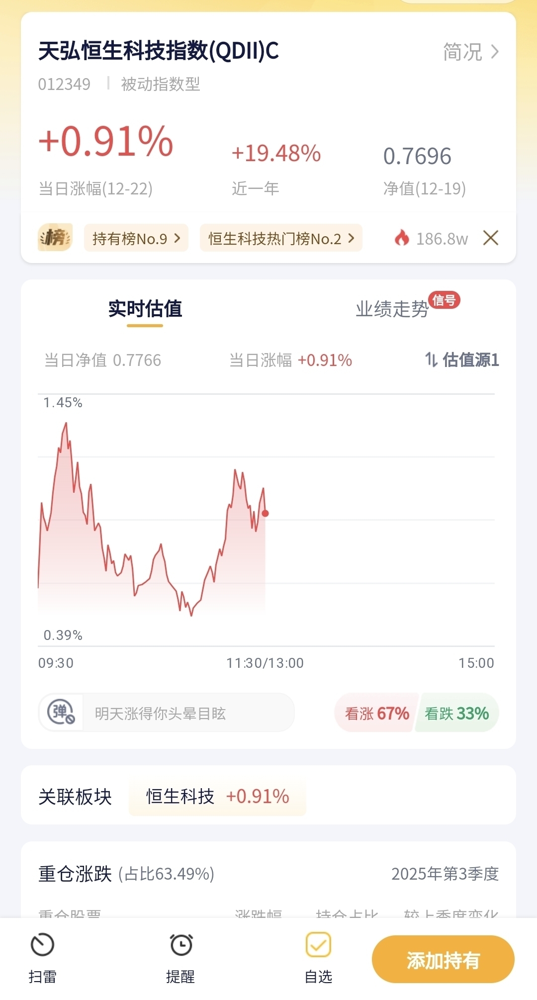 天弘恒生科技指数(QDII)**今日预估涨幅0.91%!