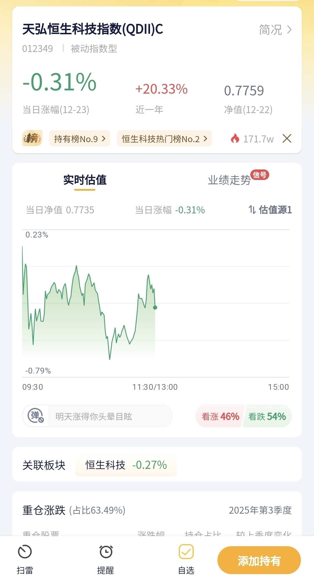 天弘恒生科技指数(QDII)今天预估跌了0.31%,主要是恒生科技指数今天表现偏弱,港股的科技股受外围市场和资金面的影响,没能跟上A股科技板块的上涨节奏。而且近期港股的流动性相对紧张,加上部分互联网科技股的业绩预期还在博弈阶段,导致恒生科技指数小幅下挫,这只跟踪该指数的基金也跟着出现了小幅下跌,不过跌幅不算大,整体还在震荡区间内。