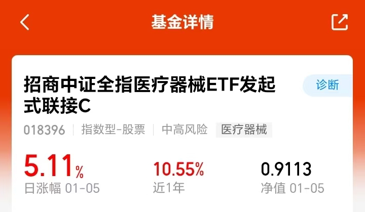 $招商中证全指医疗器械ETF发起式联接C(OTCFUND|018396)$聚焦医疗器械龙头标的,昨日斩获5.11%涨幅,板块估值当前相对较低,我觉得后市仍旧还有很大的潜力。