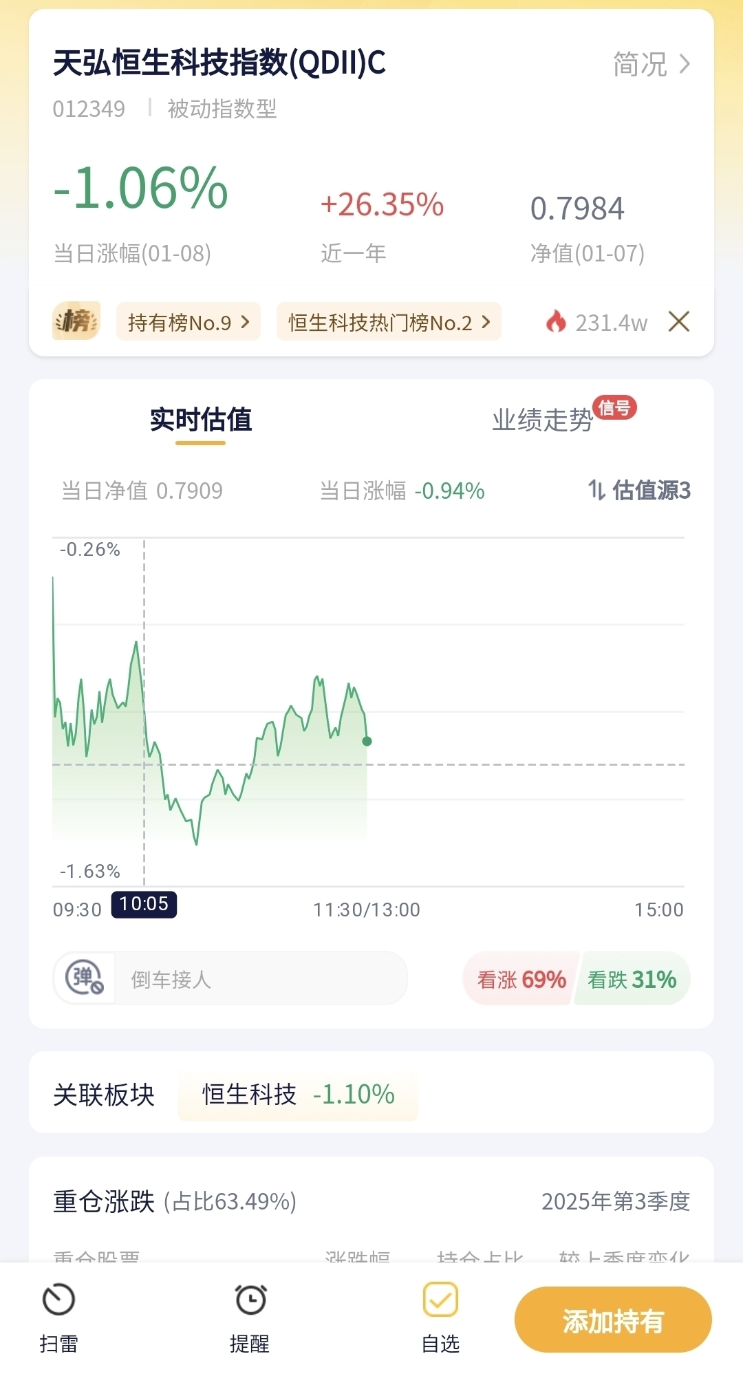 天弘恒生科技指数今天跌了1.08%,恒生科技板块今天表现拉胯。外围市场的波动加上港股自身的资金面压力,导致恒生科技相关标的普遍下跌,这只QDII基金跟踪的是恒生科技指数,自然也逃不开下跌的走势,短期港股科技还是得看外围情绪。